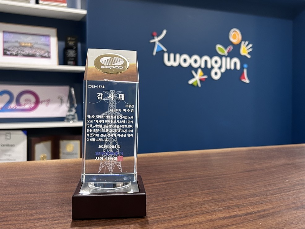 웅진이 한국전력공사의 ‘차세대 전력정보시스템(1단계) 구축사업’을 성공적으로 완료하여, 이에 한국전력공사로부터 감사패를 수여받았습니다.